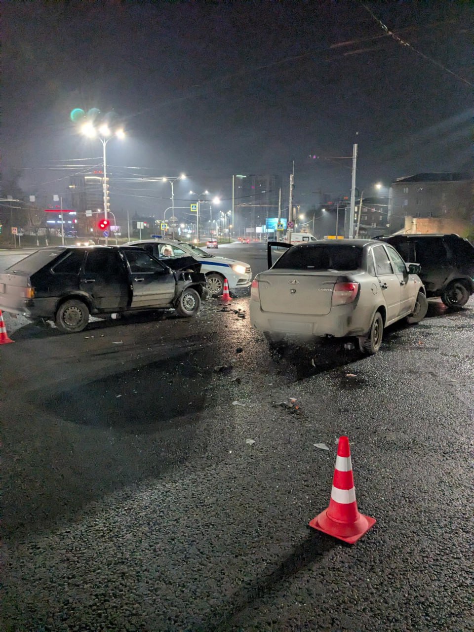 1Около 02:50, на улице 9-е Января произошло первое происшествие. 19-летний водитель автомобиля «ВАЗ 2114», находившийся в состоянии алкогольного опьянения без права управления, проехал на запрещающий сигнал светофора. Это привело к столкновению трех транспортных средств. В результате пострадали водители автомобилей «ВАЗ-2114» и «Лада Гранта».