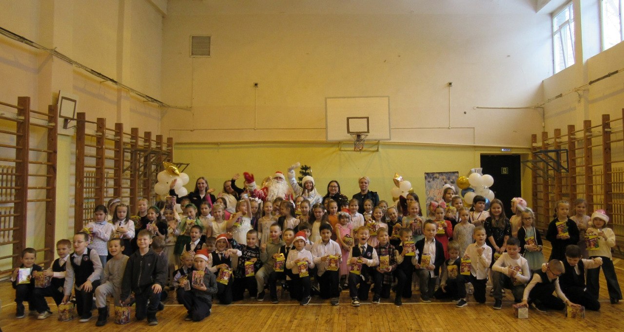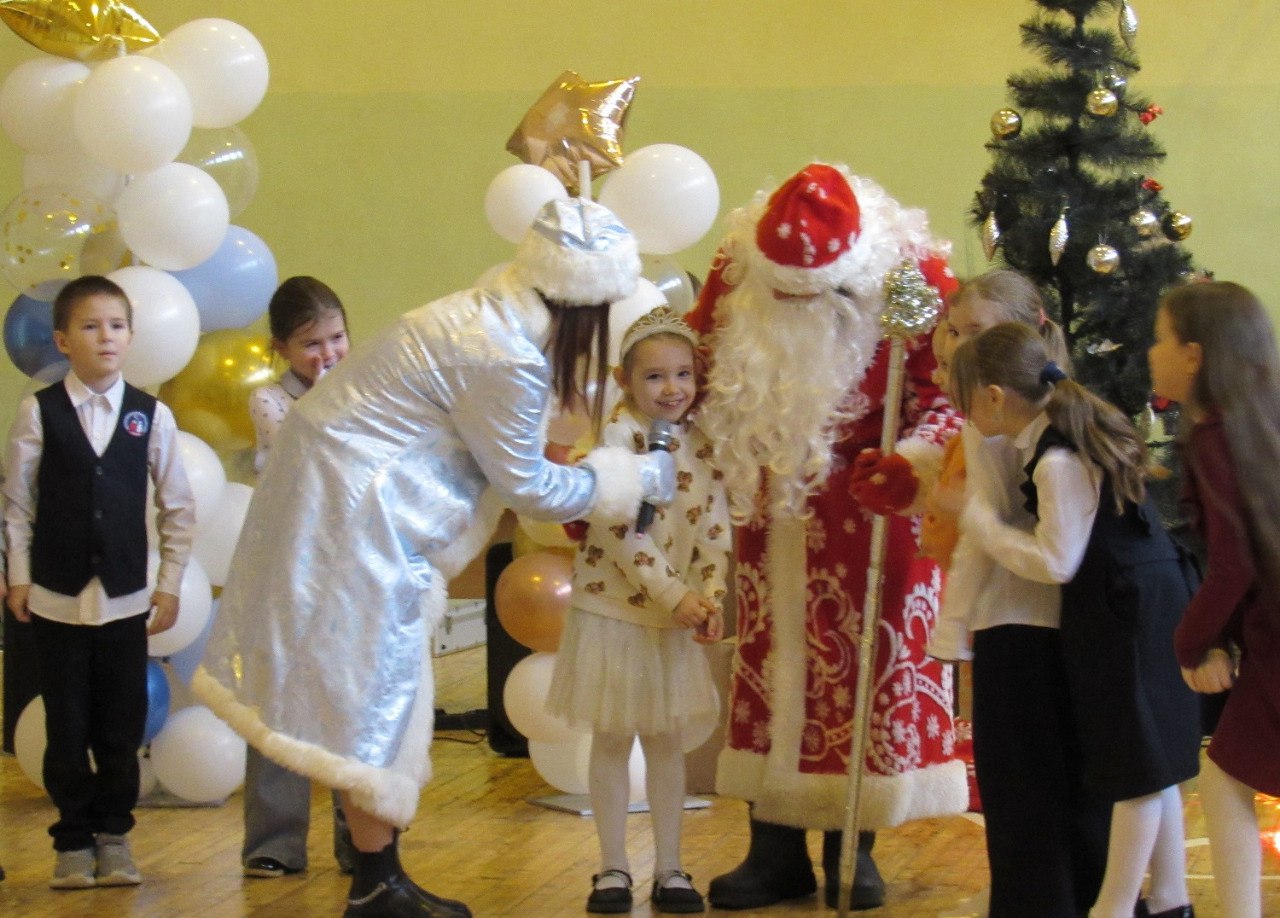 Полицейский Дед Мороз со Снегурочкой слушали стихи в исполнении школьников, водили хороводы и каждому первокласснику вручили сладкие подарки.