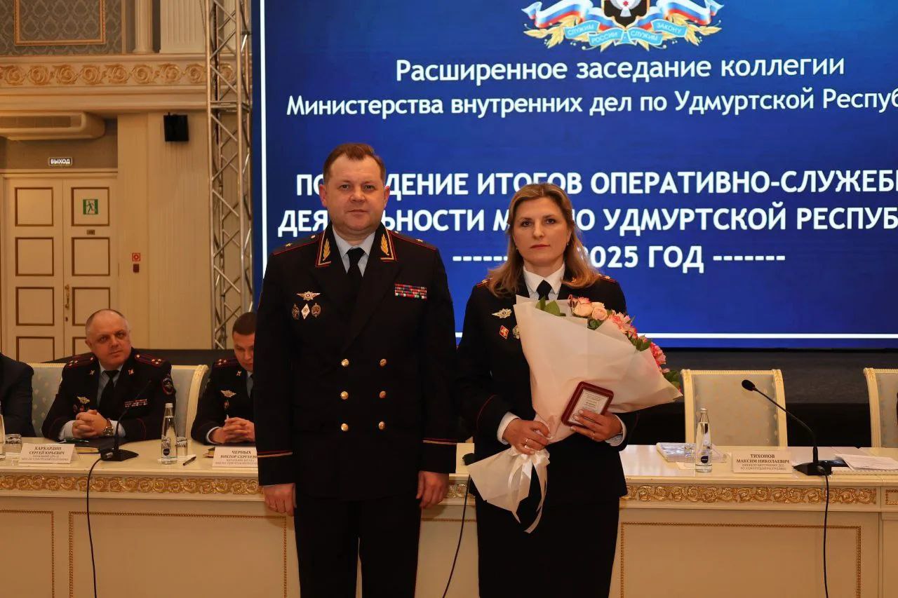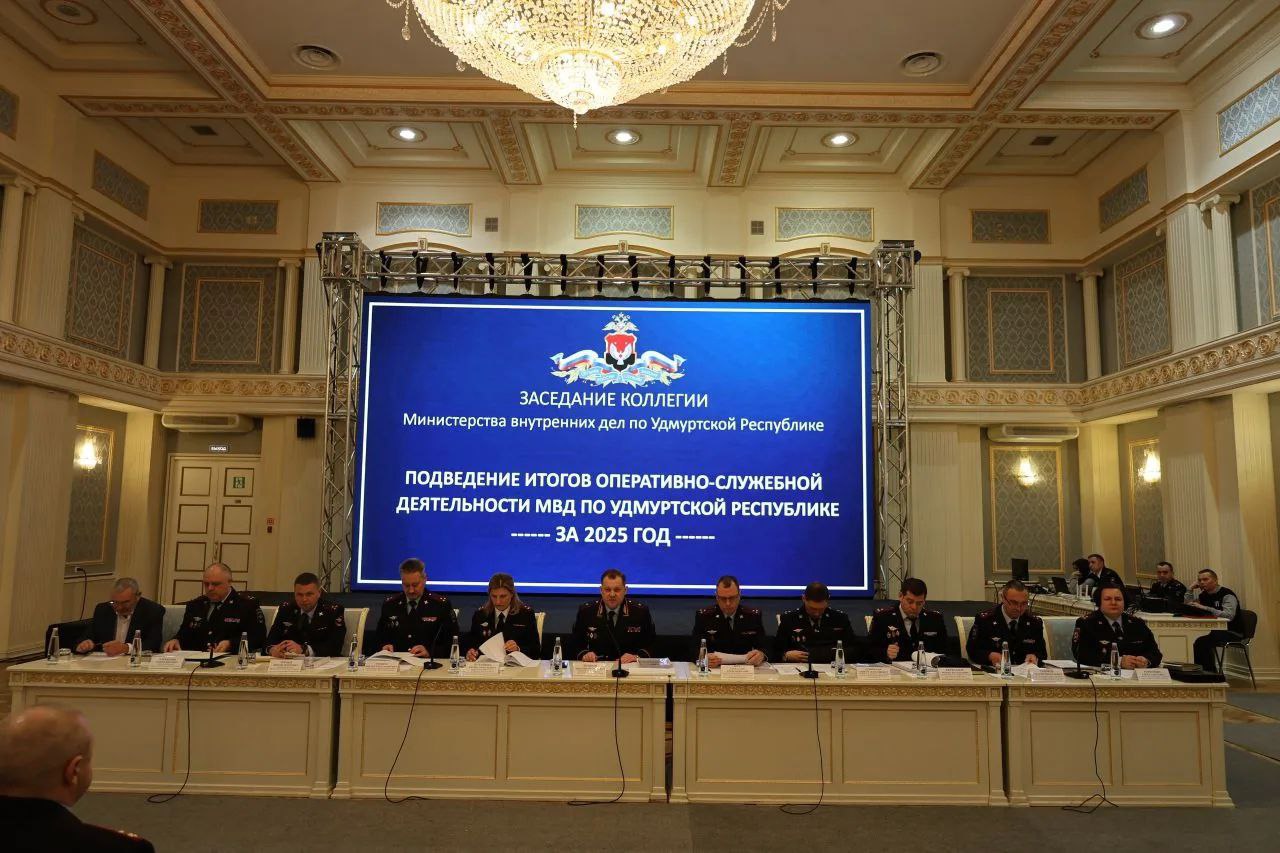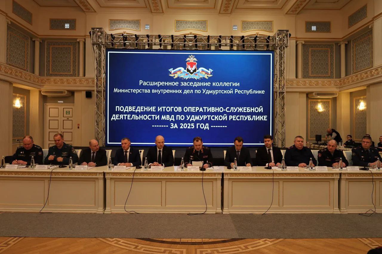 В Доме дружбы народов под председательством Министра внутренних дел по Удмуртской Республике генерал-майора полиции Максима Тихонова состоялось расширенное заседание коллегии МВД по Удмуртской Республике, на котором были подведены итоги деятельности за 2025 год. В заседании приняли участие: Председатель Правительства Удмуртии Роман Ефимов, Председатель Государственного Совета Удмуртской Республики Владимир Невоструев, Главный федеральный инспектор по Удмуртской Республике Алексей Воробьев, руководители республиканских силовых ведомств.