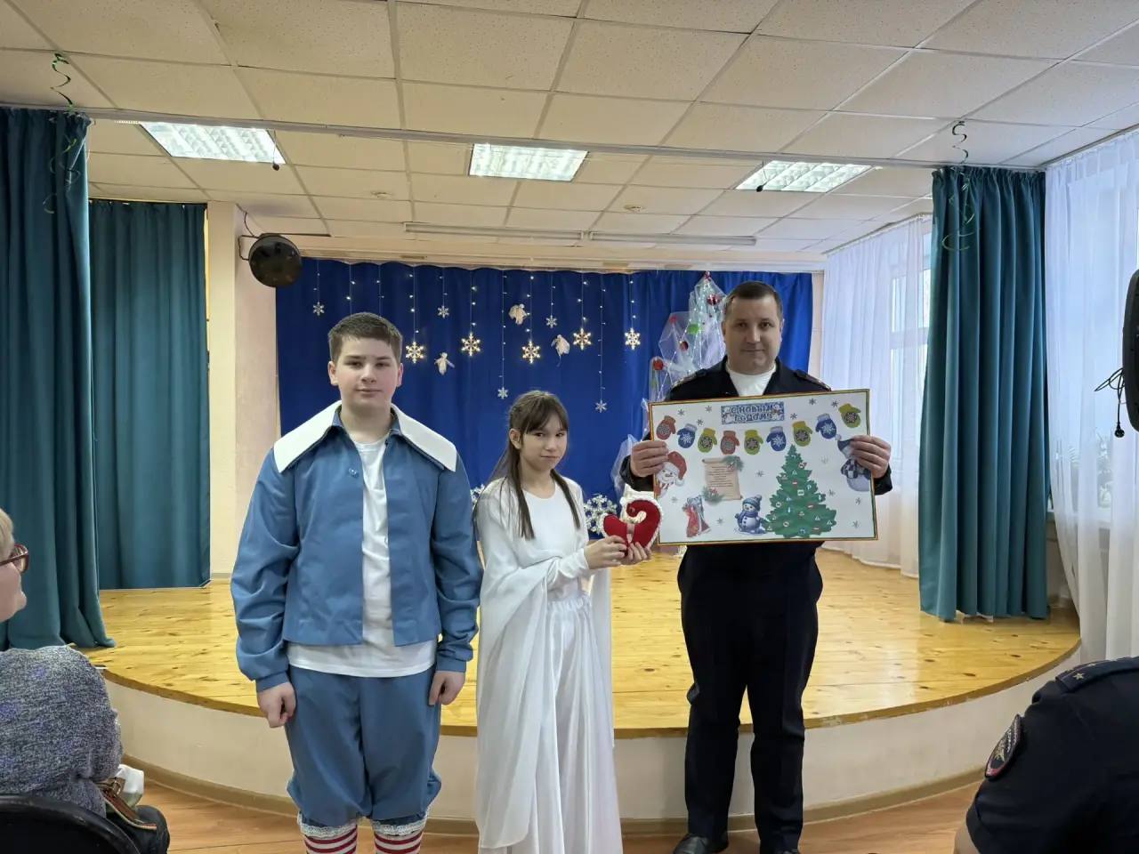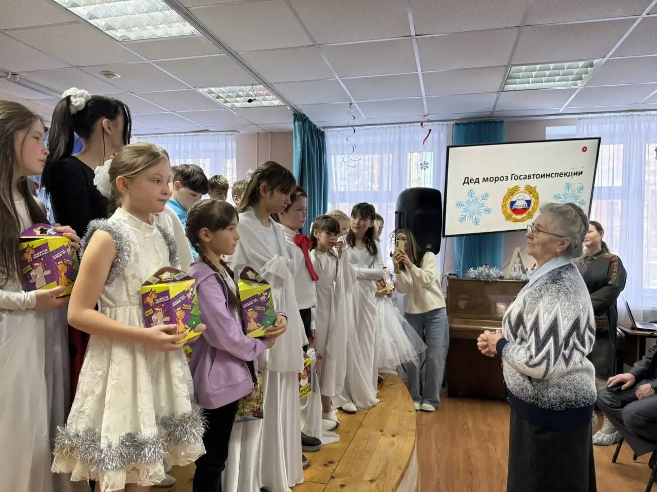 Полицейские, переодетые в Деда Мороза и Снегурочку, привезли ребятам подарки и провели интерактивную игру, напомнив о правилах дорожной безопасности. Дети, в свою очередь, подготовили для гостей праздничное представление и подарили полицейским новогодние сувениры, сделанные своими руками.
