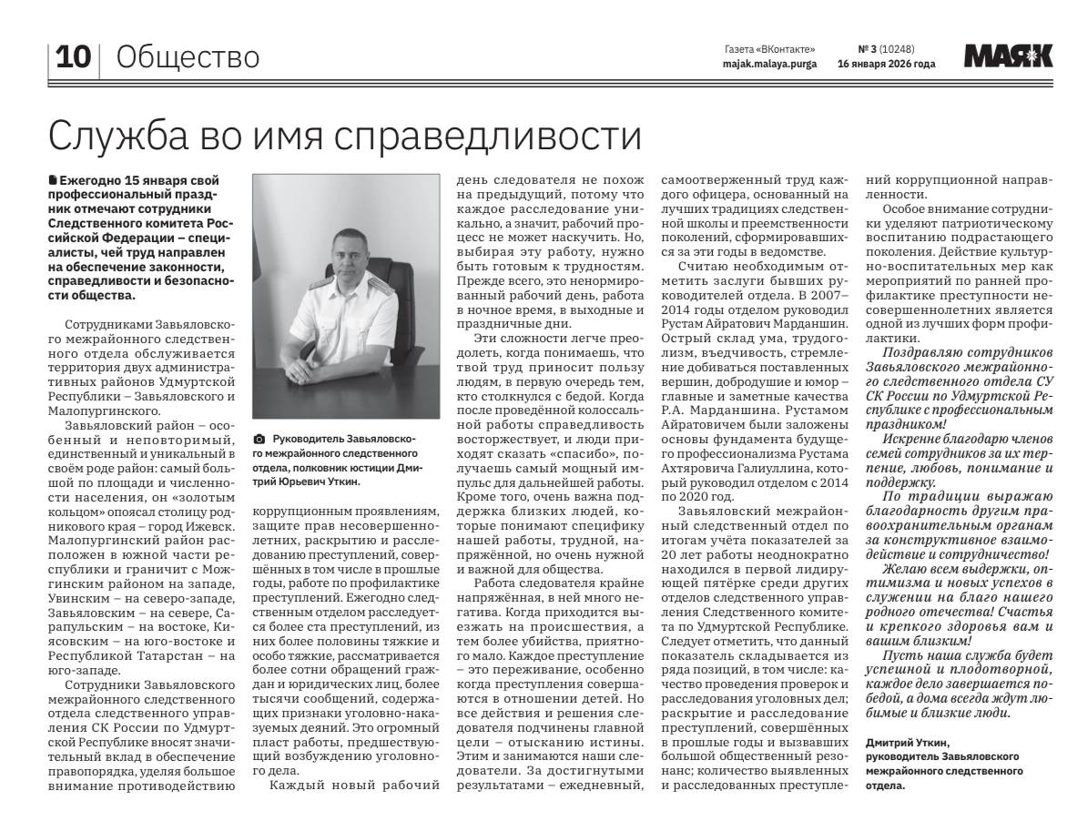 Очерк о работе Завьяловского межрайонного следственного отдела, подготовленный руководителем отдела полковником юстиции Уткиным Дмитрием Юрьевичем для издания «Маяк» Малопургинского района республики