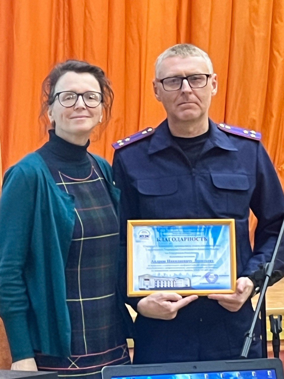 В завершение мероприятия преподаватель правовых дисциплин Елена Рудольфовна Артемичева от имени руководства колледжа вручила Андрею Леонтьеву благодарность.