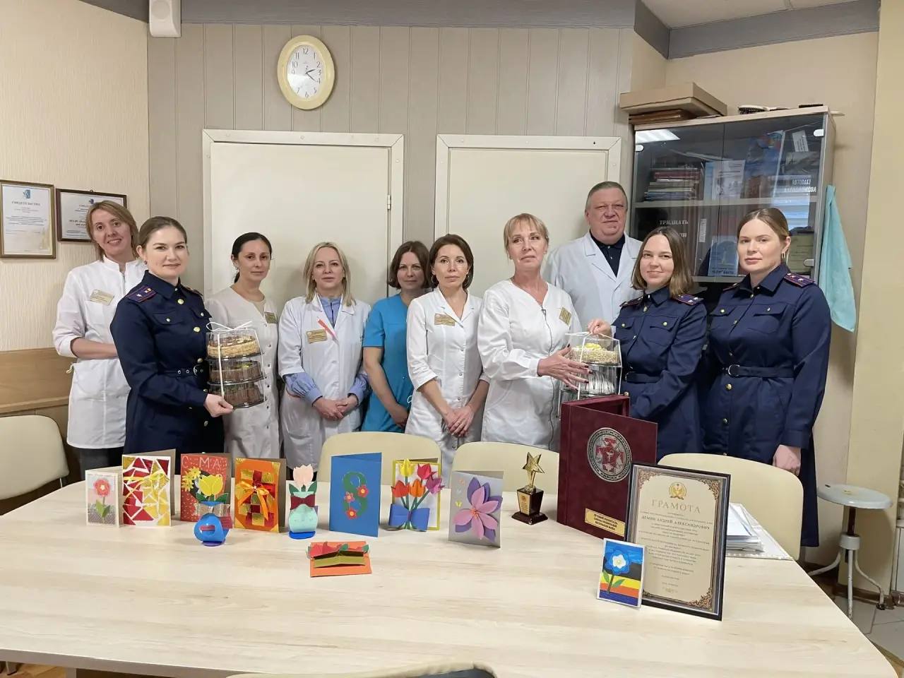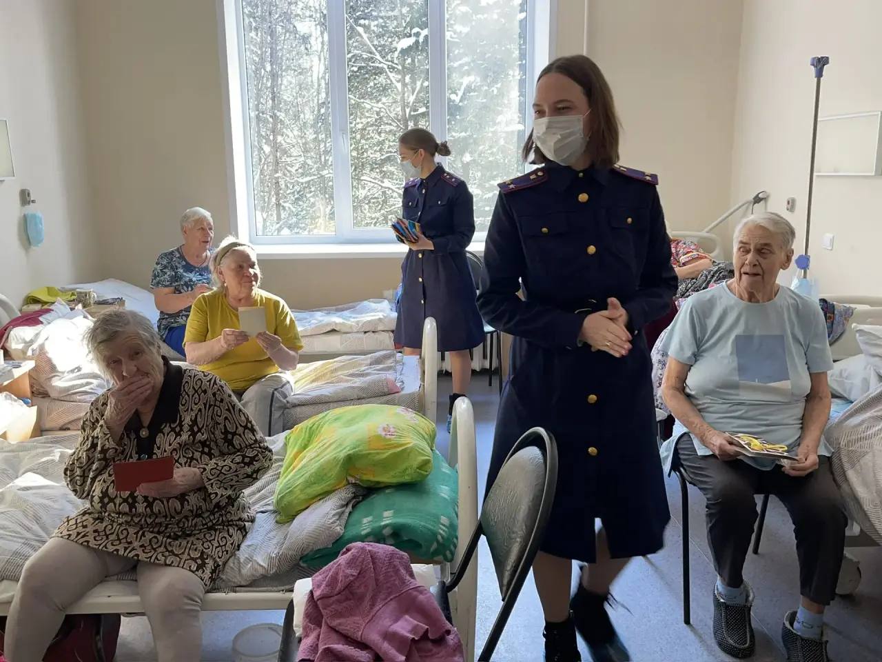 В теплой и душевной атмосфере сотрудники ведомства вручили пациенткам госпиталя выполненные ребятами из подшефного социального учреждения «Росток» открытки, а также сладкие подарки, пожелав крепкого здоровья, бодрости духа, мира и благополучия. Пациенты поблагодарили офицеров за внимание и заботу.