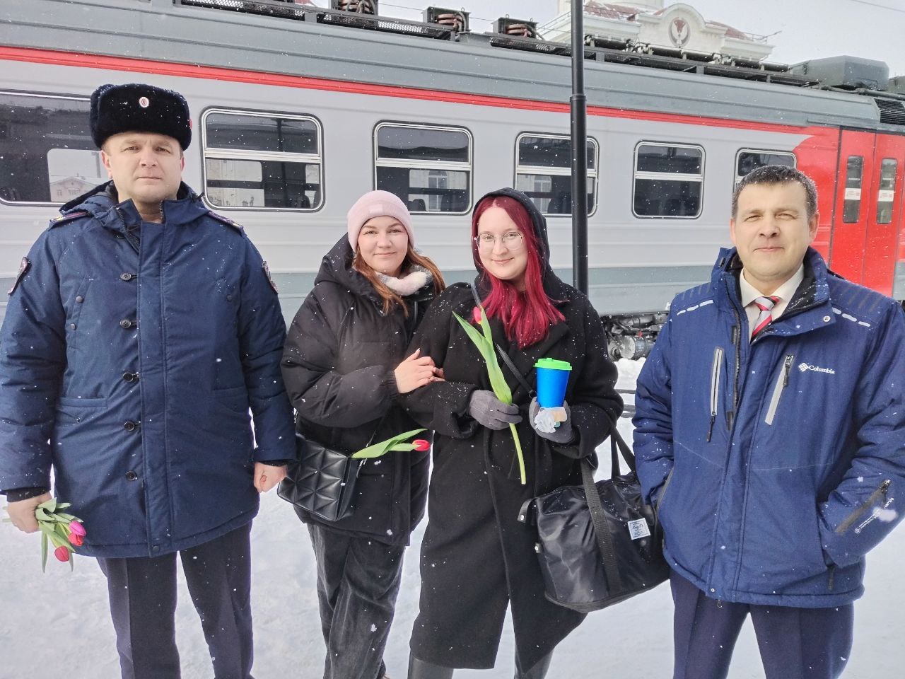 В рамках акции «8 Марта – в каждый дом» сотрудники патрульно постовой службы полиции линейного отдела также поздравили женщин на железнодорожном вокзале Ижевска. Пассажирок, прибывающих и убывающих с вокзала, встречали с цветами и добрыми пожеланиями.