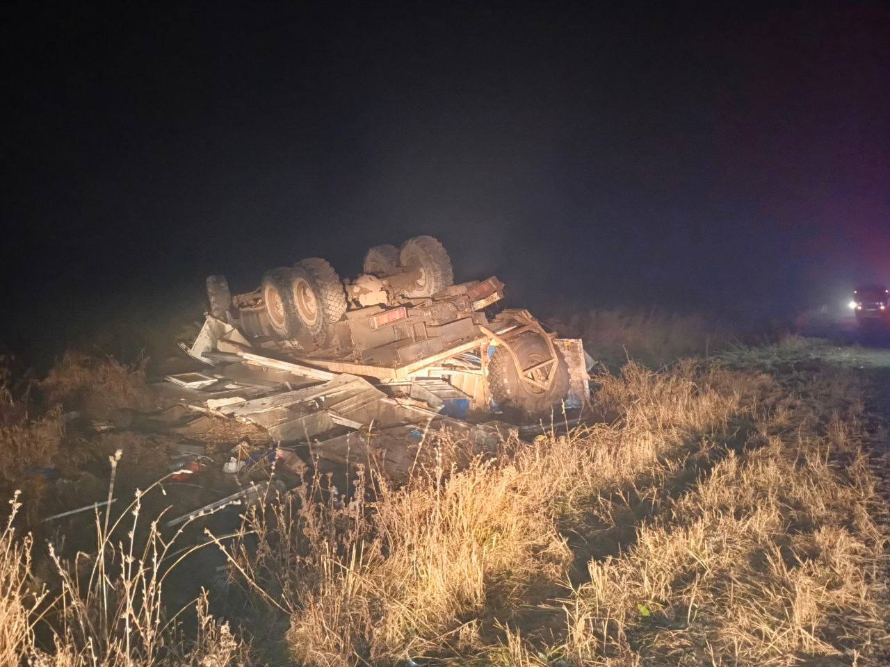 Из-за удара КАМАЗ съехал в кювет и опрокинулся.