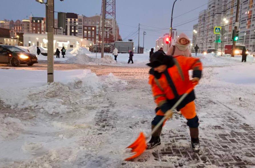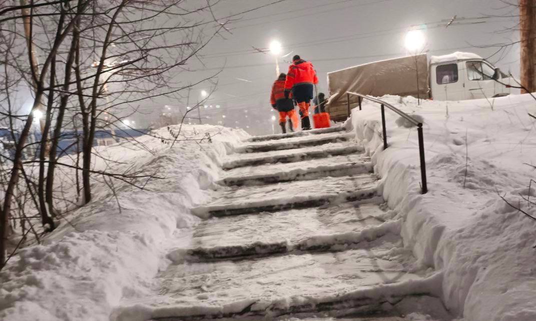 Сегодня днем продолжается расчистка тротуаров, остановок, зон пешеходных переходов, лестничных спусков.