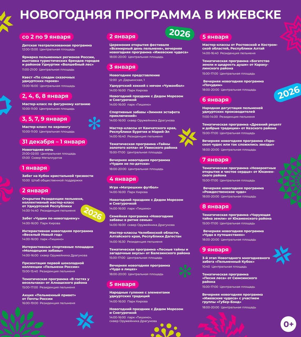 Со 2 по 9 января в Ижевске пройдет Пельменьфест. Каждый день - детские программы, вечерние концерты, тематические площадки от районов Удмуртии. А еще мастер-классы на катке, квест в ледовом лабиринте и самые разнообразные пельмени со всей России.
