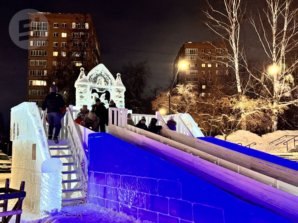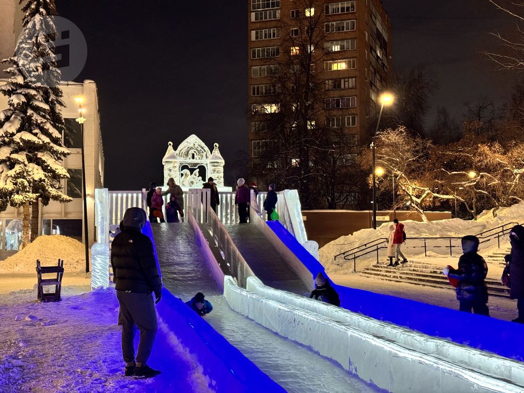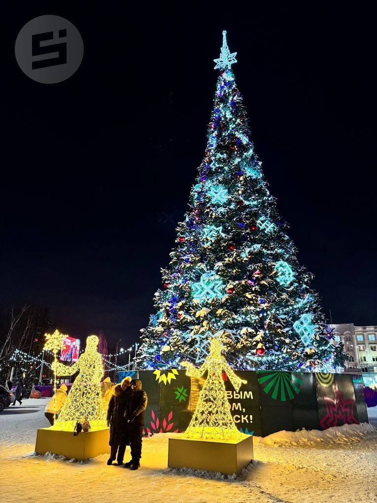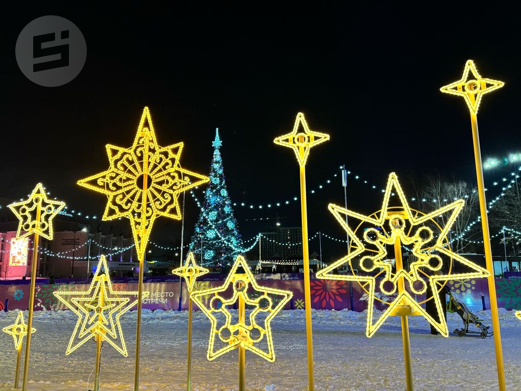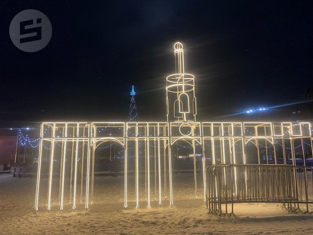 Главным элементом оформления новогодней Центральной площади Ижевска станет светящаяся арка в виде Главного корпуса оружейного завода. Рядом с ёлкой установили светящиеся фигуры Деда Мороза и Снегурочки. Горки уже тестируются детворой.