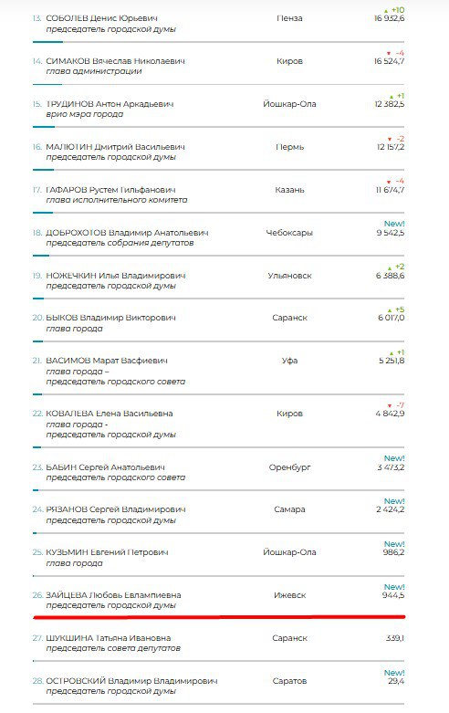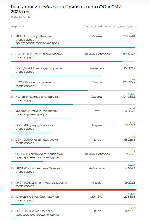 Глава Ижевска расположился на 11-м месте в списке, его показатель — 29,3 тыс. пунктов. Отмечается, что Чистяков опустился на три позиции вниз.
