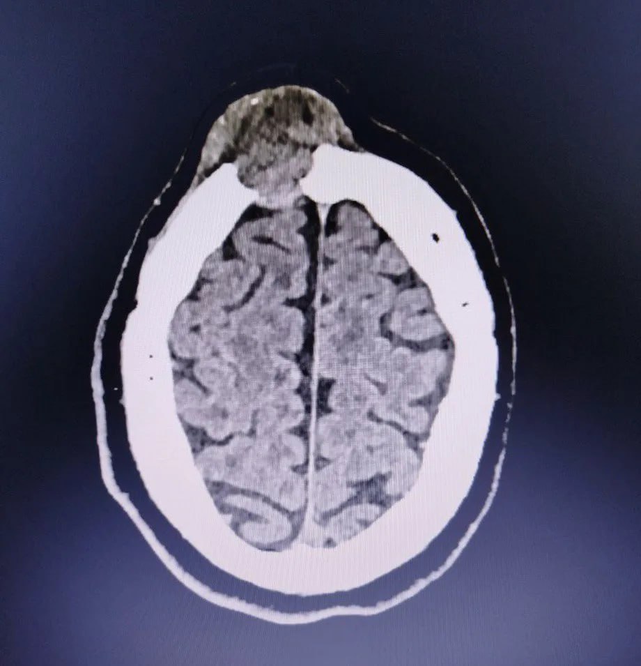 За прошедшее время она не только не прошла, но и немного подросла. Компьютерная томография показала, что это опухоль, которая уже начала разрушать лобную кость.