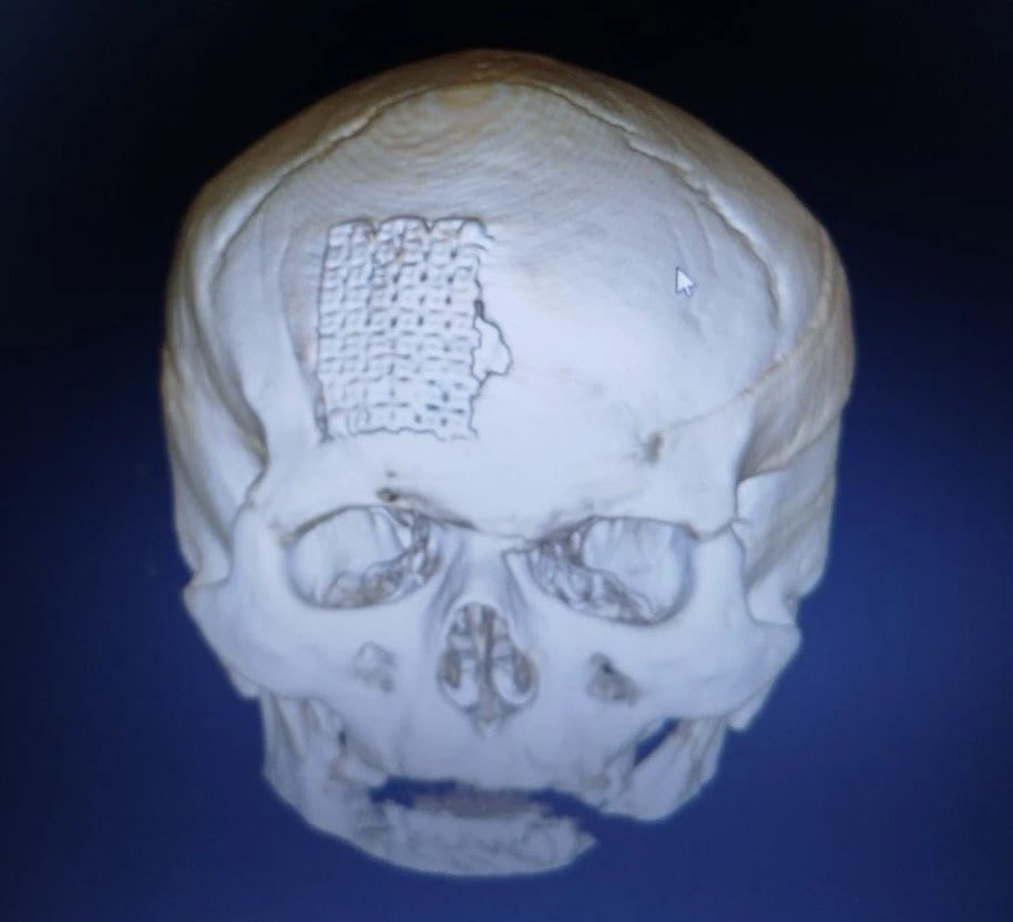 Нейрохирурги смогли удалить опухоль, сохранив все важные сосуды, очистили пораженные лобные пазухи, а также закрыли полость черепа и перекрыли сообщение с носом и внешней средой тканями пациента с бедра. Для восстановления кости лба была использована титановая пластина.