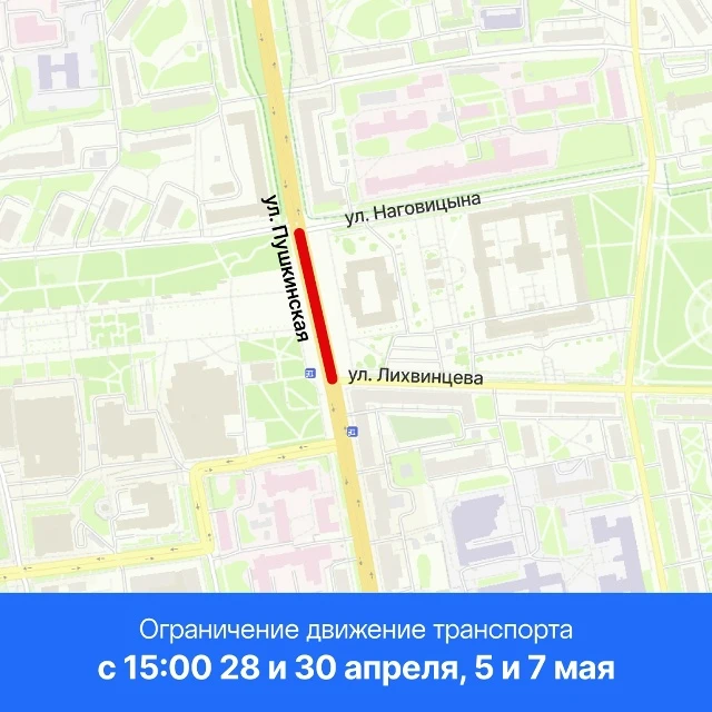 Также 28 и 30 апреля, 5 и 7 мая с 15:00 будет запрещена парковка на ул. Пушкинская от ул. Наговицына до ул. Лихвинцева.