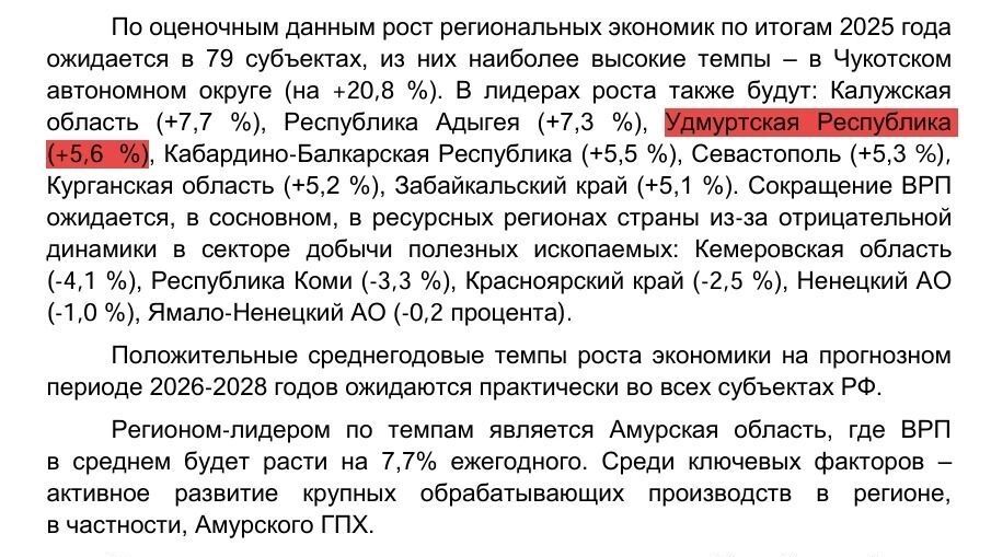 Самый высокий темп увеличения ВРП ожидается по итогам года на Чукотке — 20,8%. На втором месте Калужская область (7,7%), третье место у Адыгеи (7,3%). Удмуртия с планируемым показателем 5,6% идет четвертой, обгоняя Кабардино-Балкарию (5,5%).