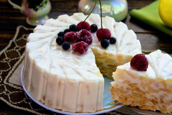 После застывания осторожно перевернуть торт на тарелку и украсить по желанию, например, свежими ягодами.