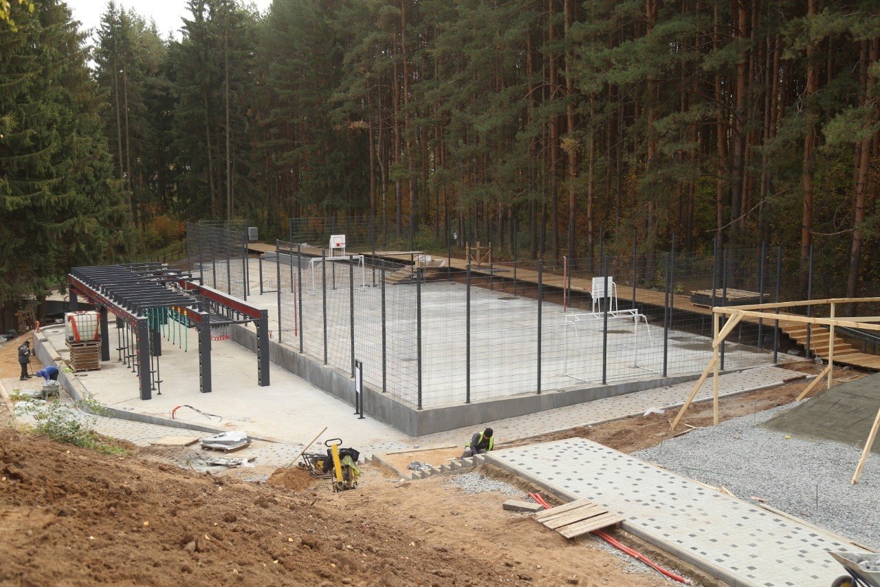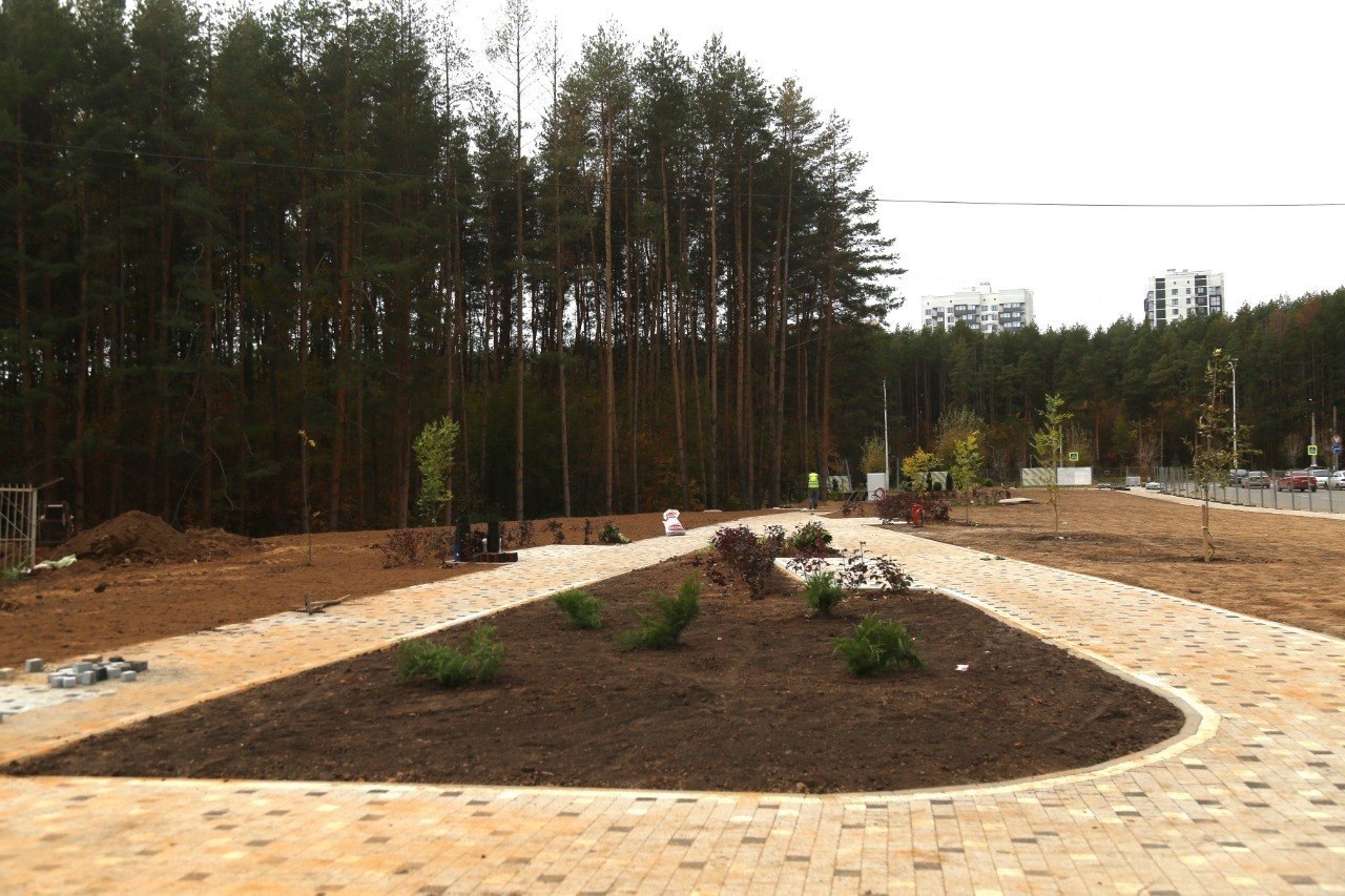До конца октября подрядчик завершит установку освещения, видеонаблюдения, входных групп, детских горок, скамеек и урн, высадит новые деревья и кустарники.