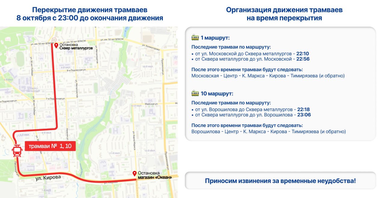 Сегодня, 8 октября, с 23:00 до окончания движения, будет закрыт проезд трамваев № 1, 10 на участке от магазина «Океан» до Сквера металлургов.
