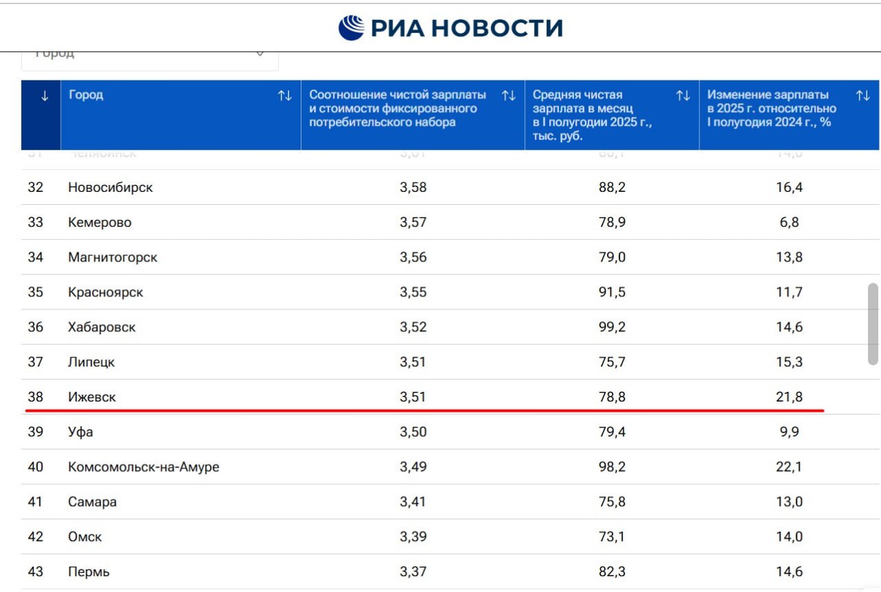 Из исследования, опубликованного РИА Новости, следует, что Ижевск стоит на 38-й строчке рейтинга по показателю средней зарплаты среди регионов страны.