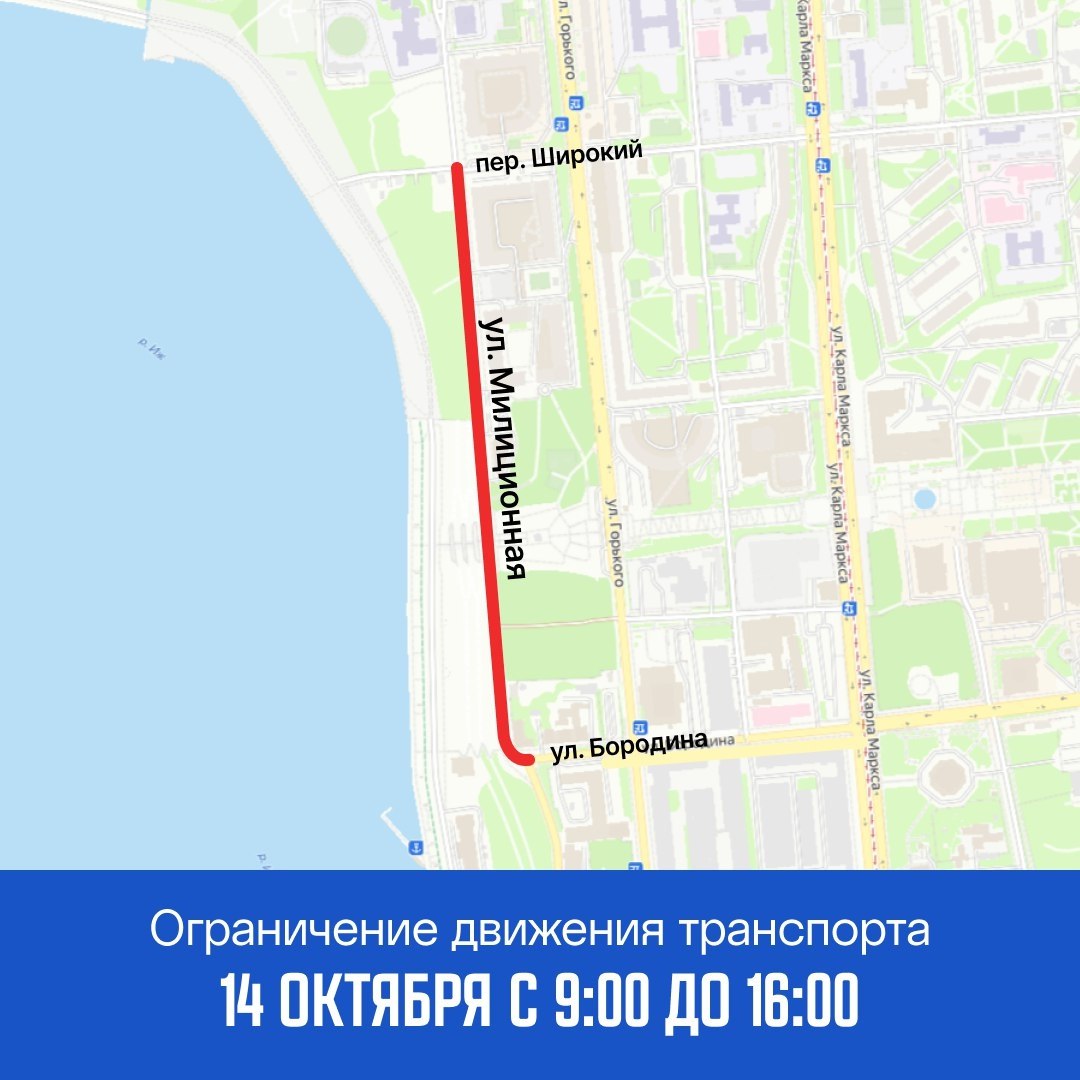 С 9:00 до 16:00 14 октября движение транспорта по ул. Милиционная на участке от пер. Широкий до ул. Бородина будет закрыто.