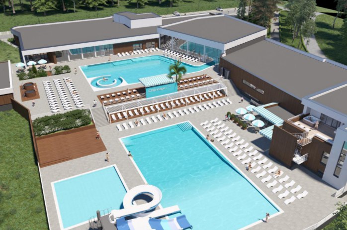 Подробно расписаны все удовольствия, которые будут получать посетители спа-парка. Центральный объект комплекса — открытый круглогодичный бассейн площадью более 650 кв. м с возможностью захода из помещения. На улице летом будет работать второй большой бассейн с аквапарком. Внутри комплекса расположатся бассейн с морской водой, гидромассажный бассейн и зона джакузи. Два бассейна для детей, открытый и закрытый, оборудуют водными аттракционами.