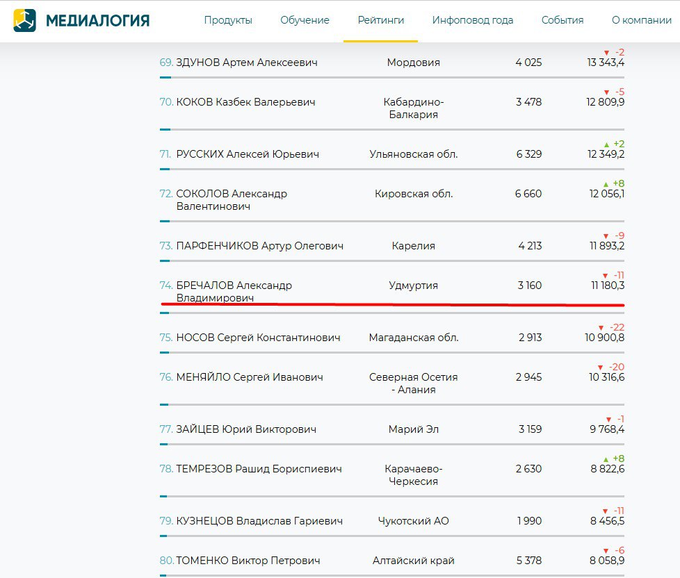 Глава Удмуртии Александр Бречалов с 3160 упоминаниями в СМИ и соцсетях занял 74-е место в рейтинге, опустившись на 11 позиций вниз по сравнению с августом, когда главу республики упомянули 3751 раз и он занял 63-е место рейтинга.