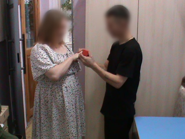 В специальной комнате свиданий молодожёны обменялись кольцами и получили свидетельство о регистрации брака. Чтобы отпраздновать важное событие, им предоставили длительное свидание в три дня.