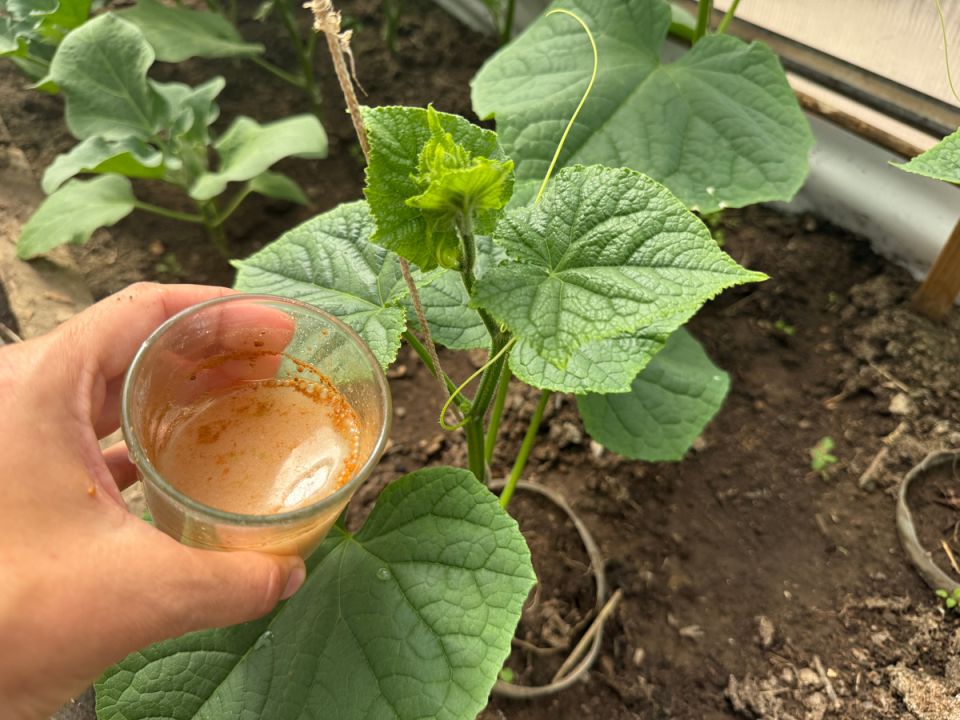 Настой лучше вносить под каждый куст огурцов в объеме одного стакана (250 мл). Рекомендуется проводить подкормку в вечернее время или в пасмурные дни, чтобы избежать ожогов на листьях. Частота применения — раз в 10-14 дней на протяжении всего роста растений.