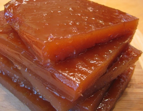 Готовый мармелад нарезается, укладывается в стопку, между слоями кладется пергамент, и помещается в холодильник для хранения.