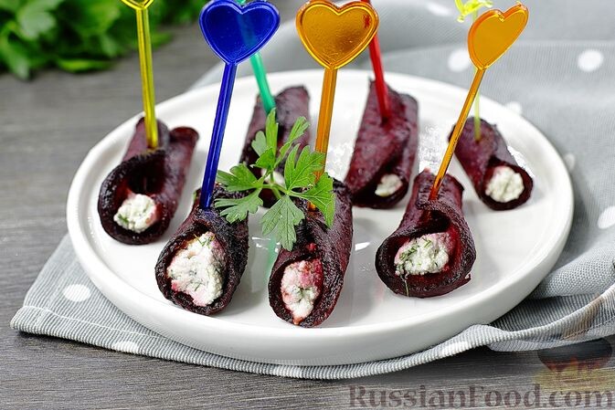 - Свекольные рулетики с нежной творожной начинкой. Эти мини-деликатесы идеально подойдут для легкого перекуса или праздничного стола. Обжаренные кружочки свеклы, фаршированные творогом с добавлением свежего укропа и молотой зиры, создают гармоничное сочетание вкусов.
