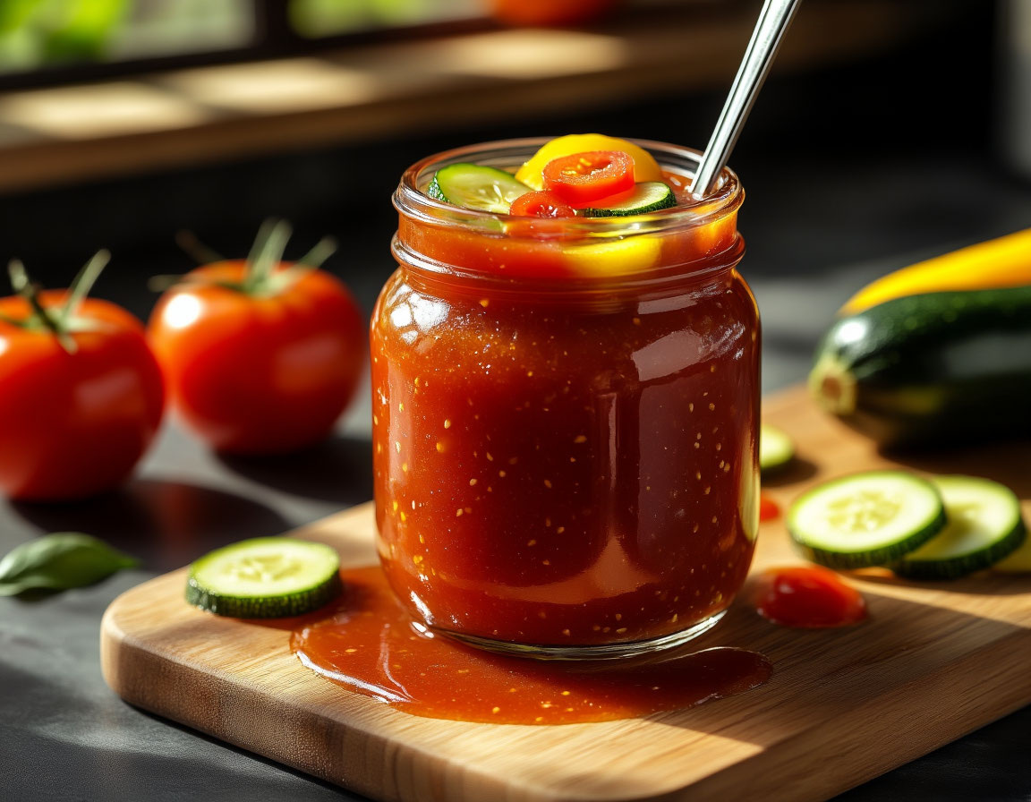 В завершающий этап вливаем 100 мл 9%-ного уксуса. Горячую массу раскладывают по предварительно стерилизованным банкам и снова стерилизуют: 7–10 минут для банок объемом 0,5 л и 12–15 минут для 1 л. Такой соус не только украсит любое блюдо, но и позволит наслаждаться ароматом лета даже в холодные зимние дни.