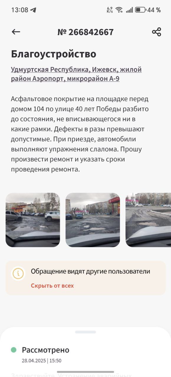 Я направлял обращение через ресурс «Решаем вместе» с просьбой провести ремонт площадки в районе домов 104, 98 и 96 и торгового павильона по улице 40 лет Победы. Через данную площадку осуществляется въезд во дворы домов 90... 108. Площадка ужасно разбита и не ремонтировалась с 1986 года (с момента строительства).