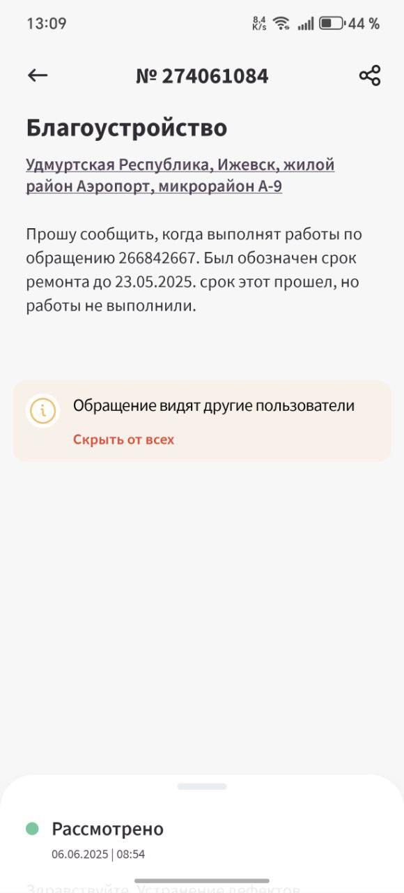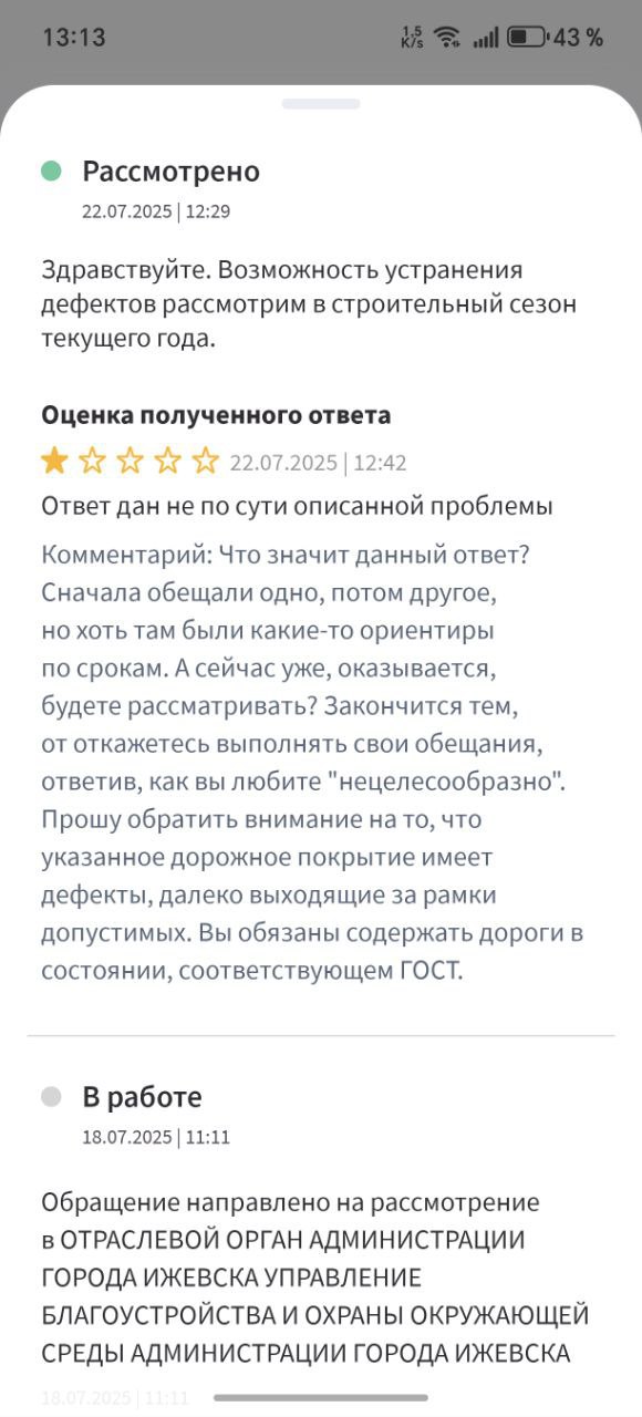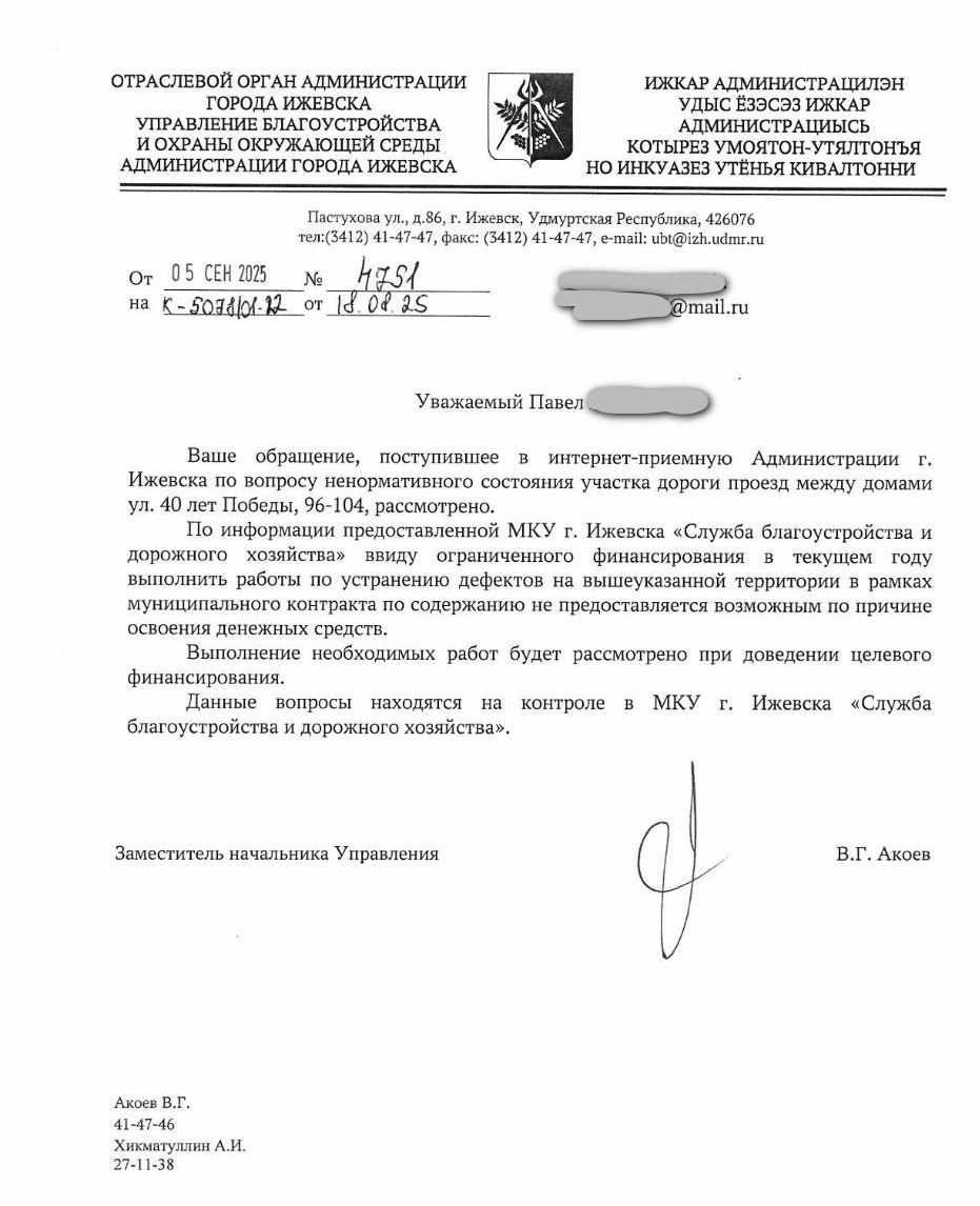 Сначала ижевчанин получил ответ от управления благоустройства города Ижевска: «Устранение аварийных дефектов планируем выполнить до 23.05.2025 г.»