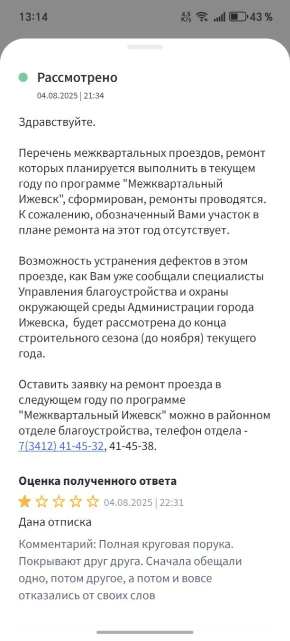 Будто бы они не знали, что денег нет?! Очень странное поведение управления благоустройства. И такими отписками они занимаются системно… По поводу двух моих обращений: они даже приглашали меня на техсовет и соглашались со мной, внося мои предложения в протокол, но всё равно ничего не делалось (одно из мероприятий не выполнено уже более года),
