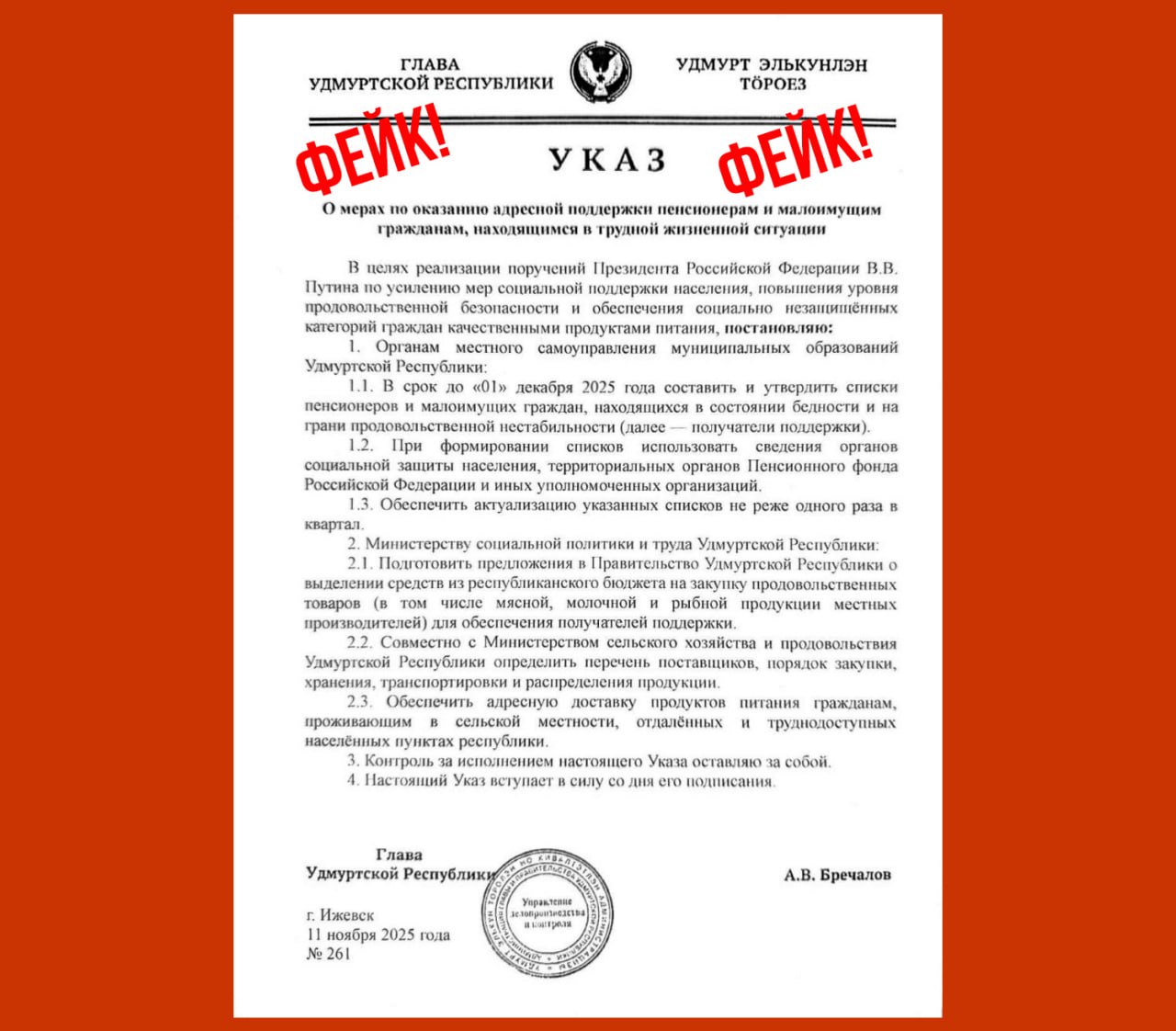 Новый фейковый указ о поддержке пенсионеров и малоимущих в Удмуртии разоблачили в ЦУРе.