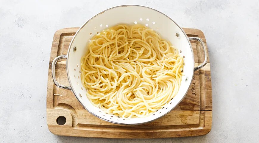 Сначала стоит заняться спагетти. Положить их в кастрюлю с подсоленной кипящей водой и варить, следуя указаниям на упаковке. Рекомендуется не переваривать макароны: остановитесь, когда они станут al dente, то есть чуть-чуть твердыми, а это обычно на пару минут меньше указанного времени. После варки откиньте спагетти на дуршлаг, чтобы убрать лишнюю воду.