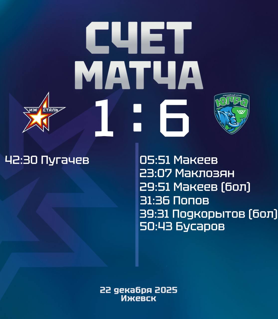 Игра прошла 22 декабря на крытом катке «Олимпиец» в Ижевске (6+). Итоговый счёт — 1:6 в пользу хоккеистов из Ханты-Мансийска.