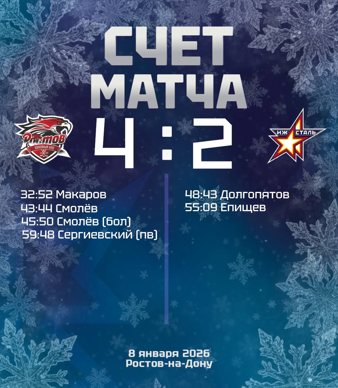 В Ростове-на-Дону 8 января прошёл хоккейный матч между командами «Ижсталь» и «Ростов» (6+), сообщает пресс-служба «сталеваров».