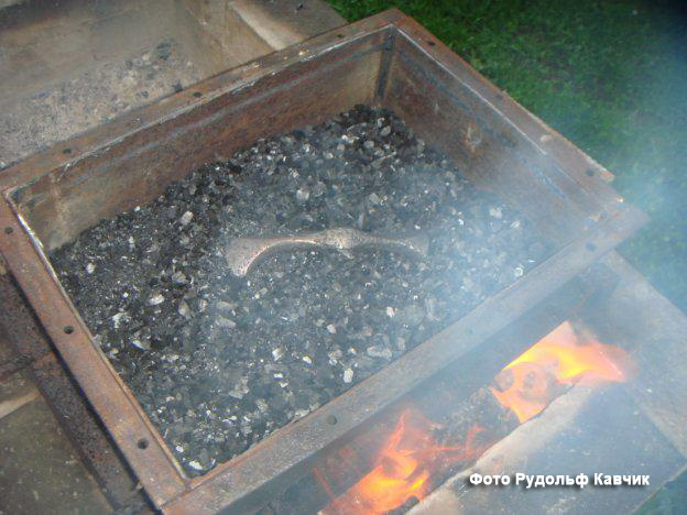 - Изделие периодически погружается в уголь и переворачивается, чтобы обеспечить равномерное воронение.
