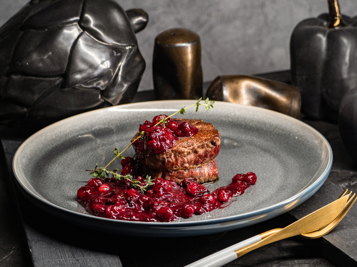 Сняв бечевку, мясо можно нарезать крупными медальонами или подать целиком, полив горячим ягодным соусом. В качестве гарнира подойдут запечённые овощи, картофельный гратен или пюре, чтобы не отвлекать внимание от этого великолепного главного блюда. Филе-миньон с ягодами сделает новогоднюю ночь поистине сказочной, задав настроение уюта и праздника.
