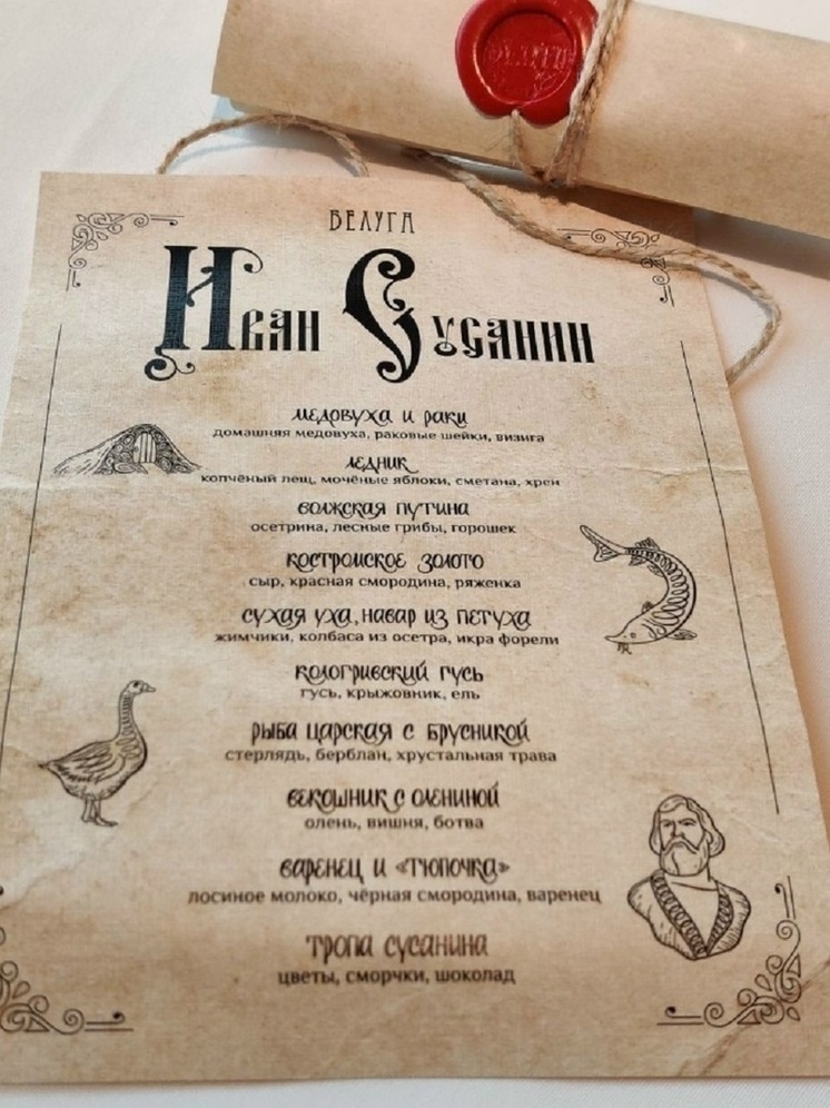 Шеф-повар Роман Чистов, который сам родом из Костромской области, создал настоящую гастрономическую симфонию на основе деликатесов из «Гусиной столицы». Кроме «кологривского гуся» в меню можно найти десять других изысканных блюд, включая такие как:
