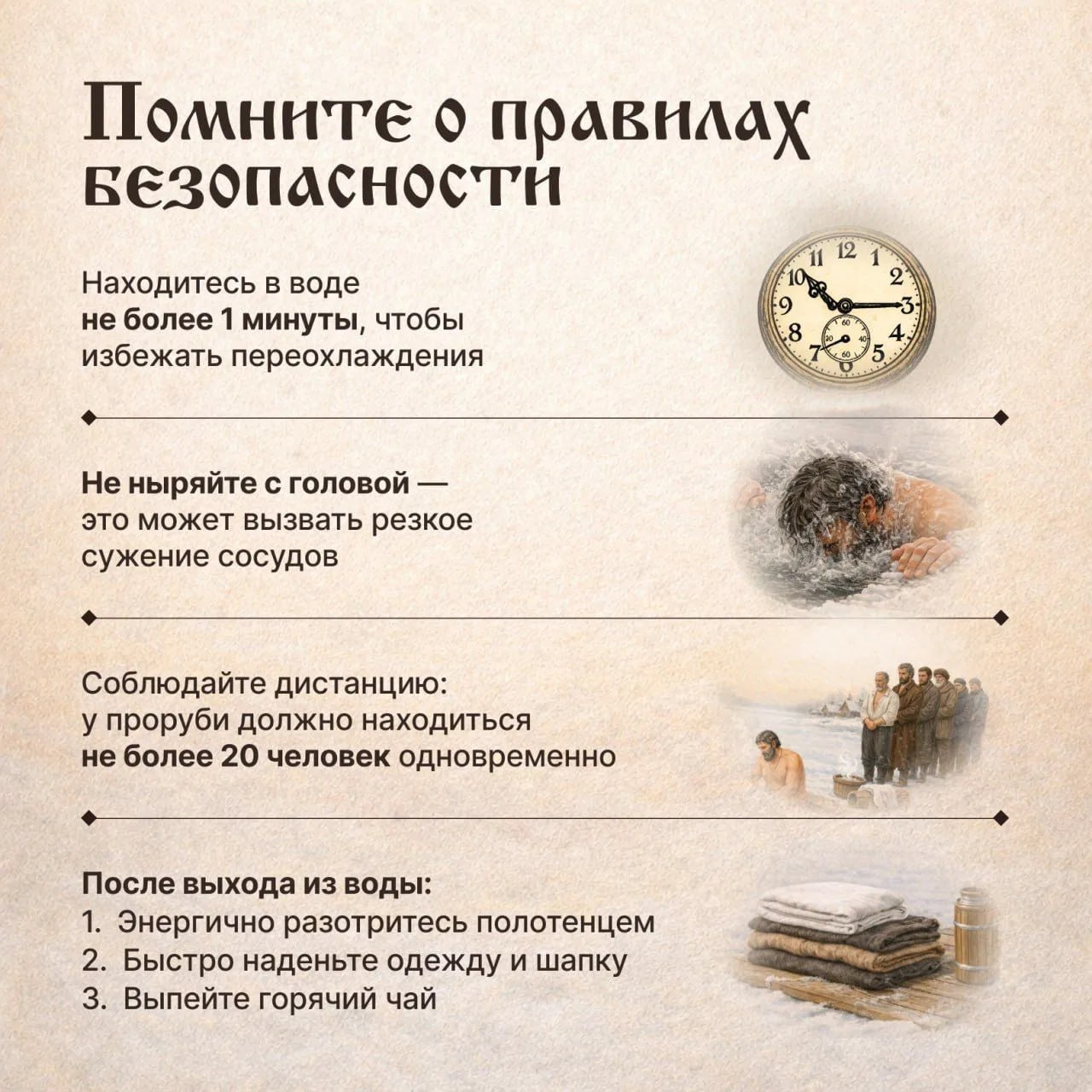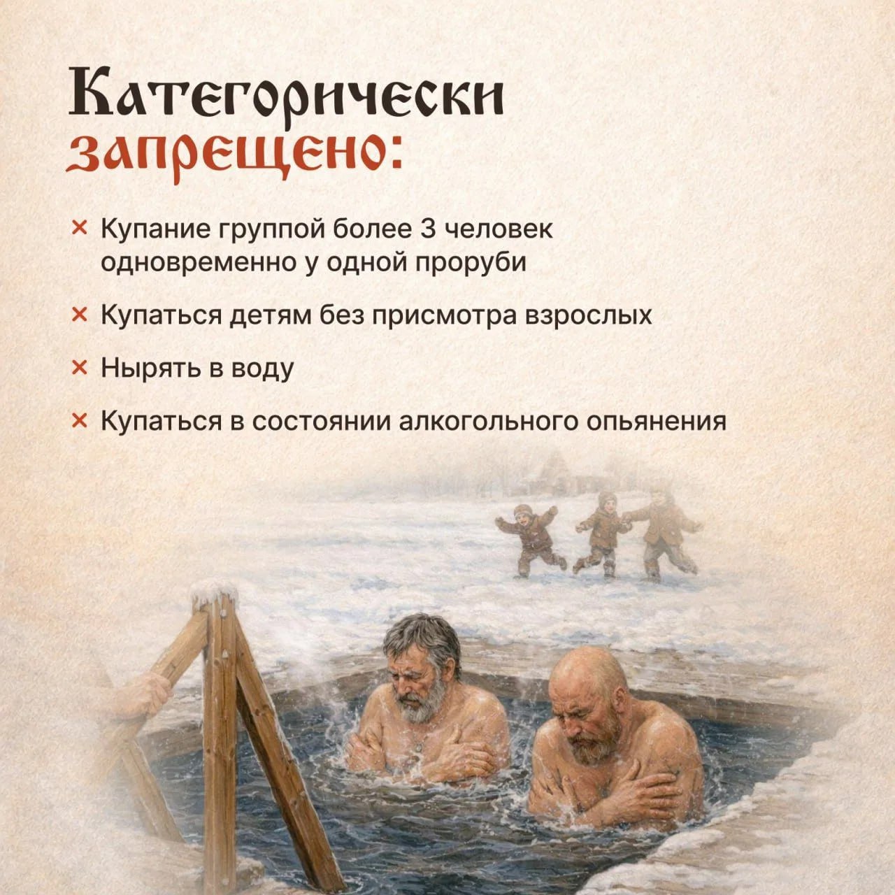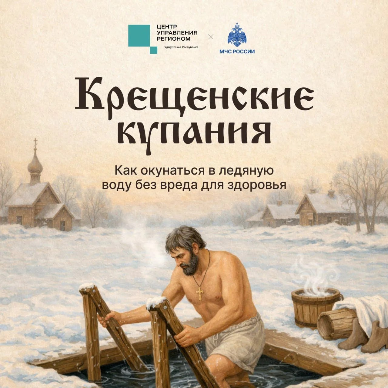 Где на Крещенье будут открыты купели и о чём нужно помнить, чтобы окунаться в прорубь без вреда для здоровья, читайте в карточках, подготовленных ЦУР и МЧС Удмуртии.