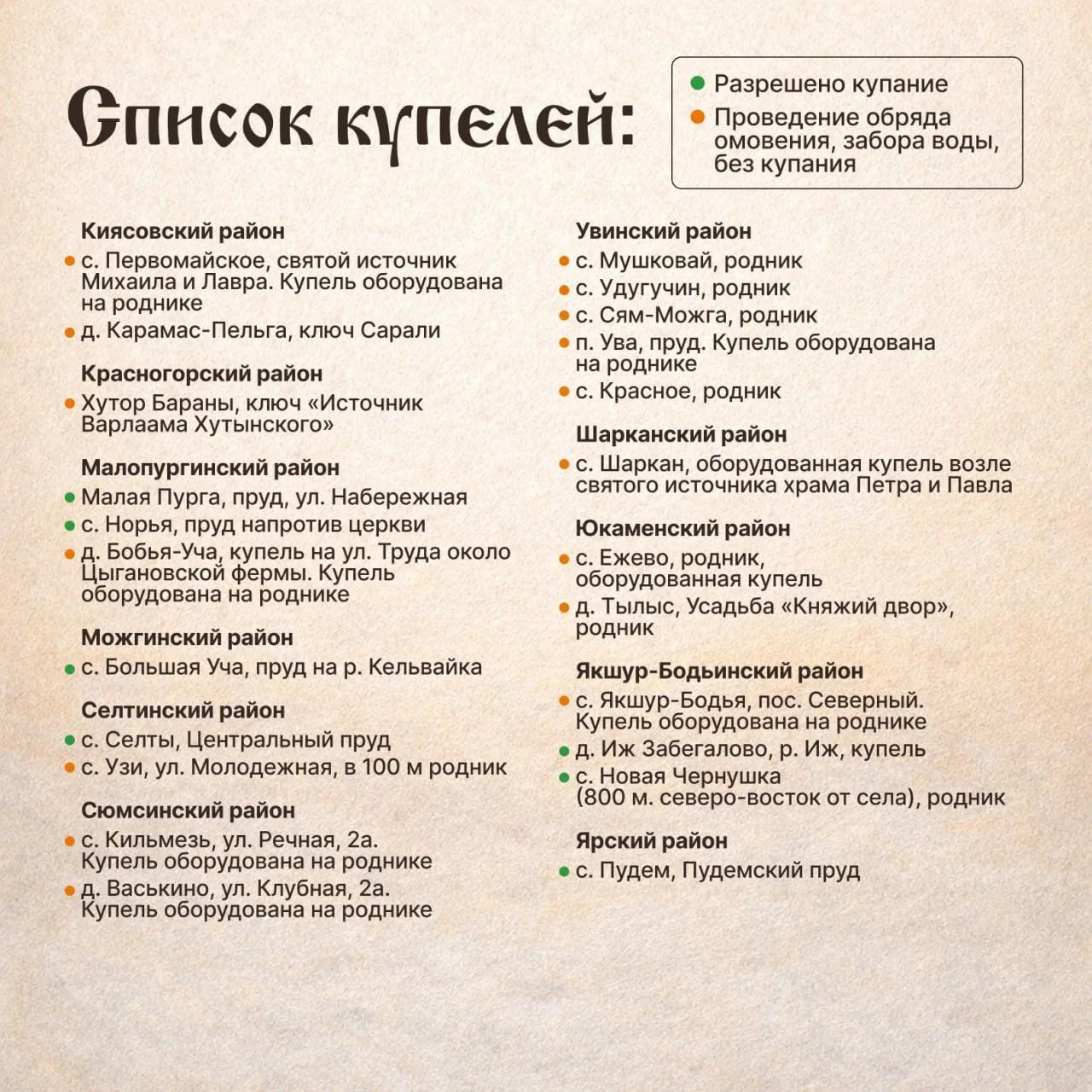 Список купелей может измениться из-за погоды и состояния толщины льда. Перед поездкой уточняйте актуальную информацию на сайте МЧС Удмуртии или на ресурсах местных администраций.