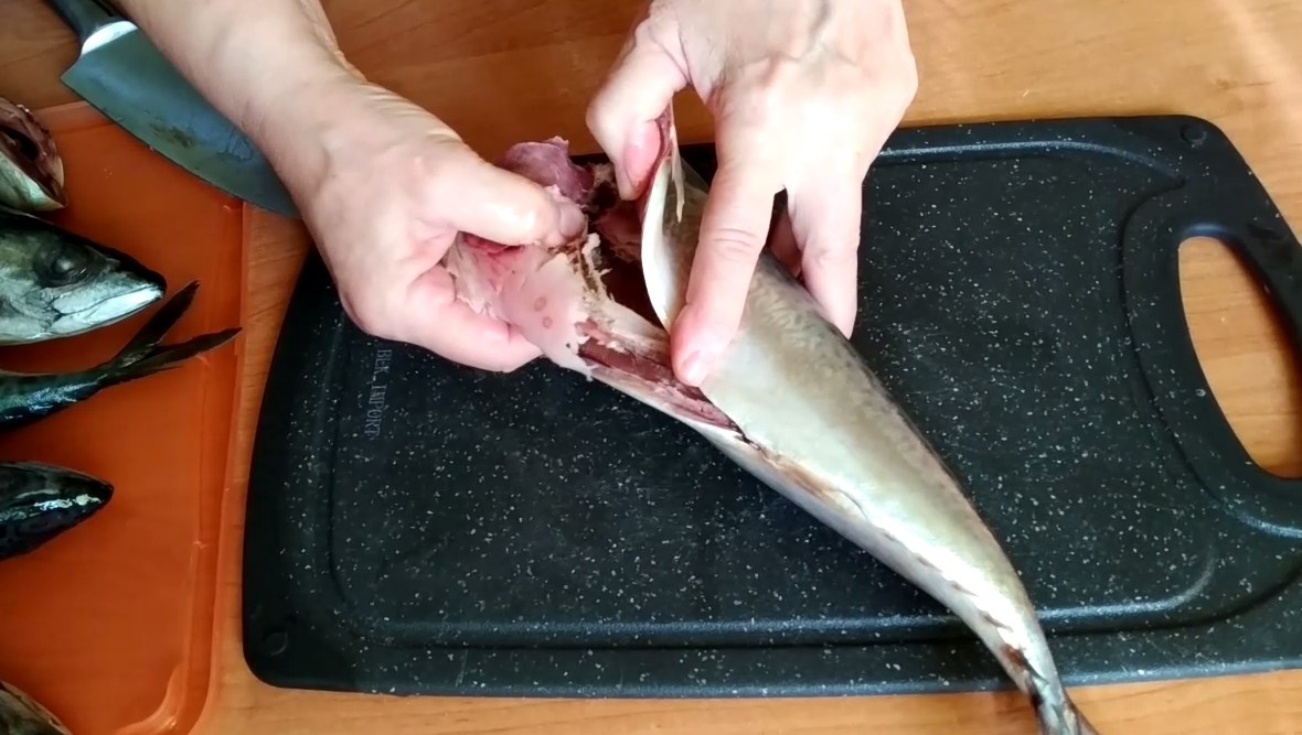 Итак, чтобы получить наиболее качественную скумбрию, лучше выбирать рыбу крупного размера, которая прошла шоковую заморозку. Это обеспечивает упругую текстуру и насыщенный вкус. С легким размораживанием её удобнее будет подготовить — отрезать голову и вспороть брюшко, а затем тщательно промыть под проточной водой.
