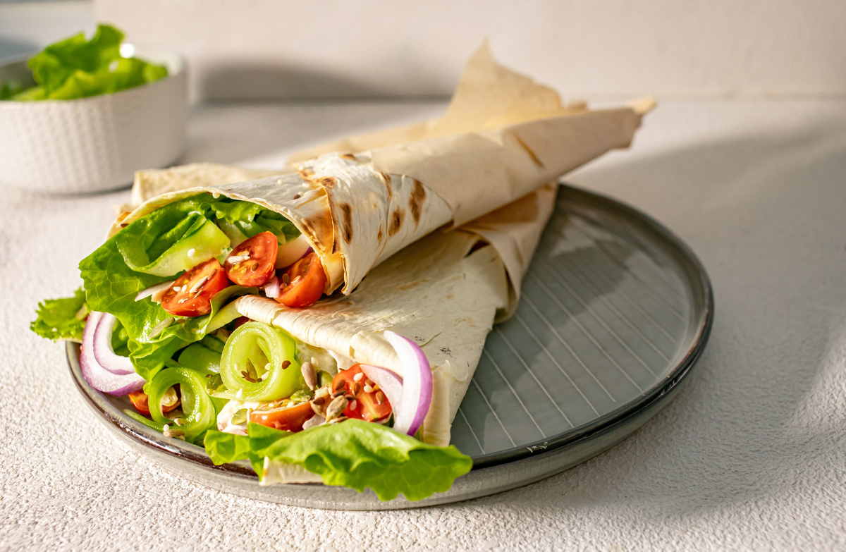 Лаваш скручивается в кулек, закрепляется зубочисткой и немного запекается при температуре 180°C, чтобы избежать быстрого размягчения от начинки.