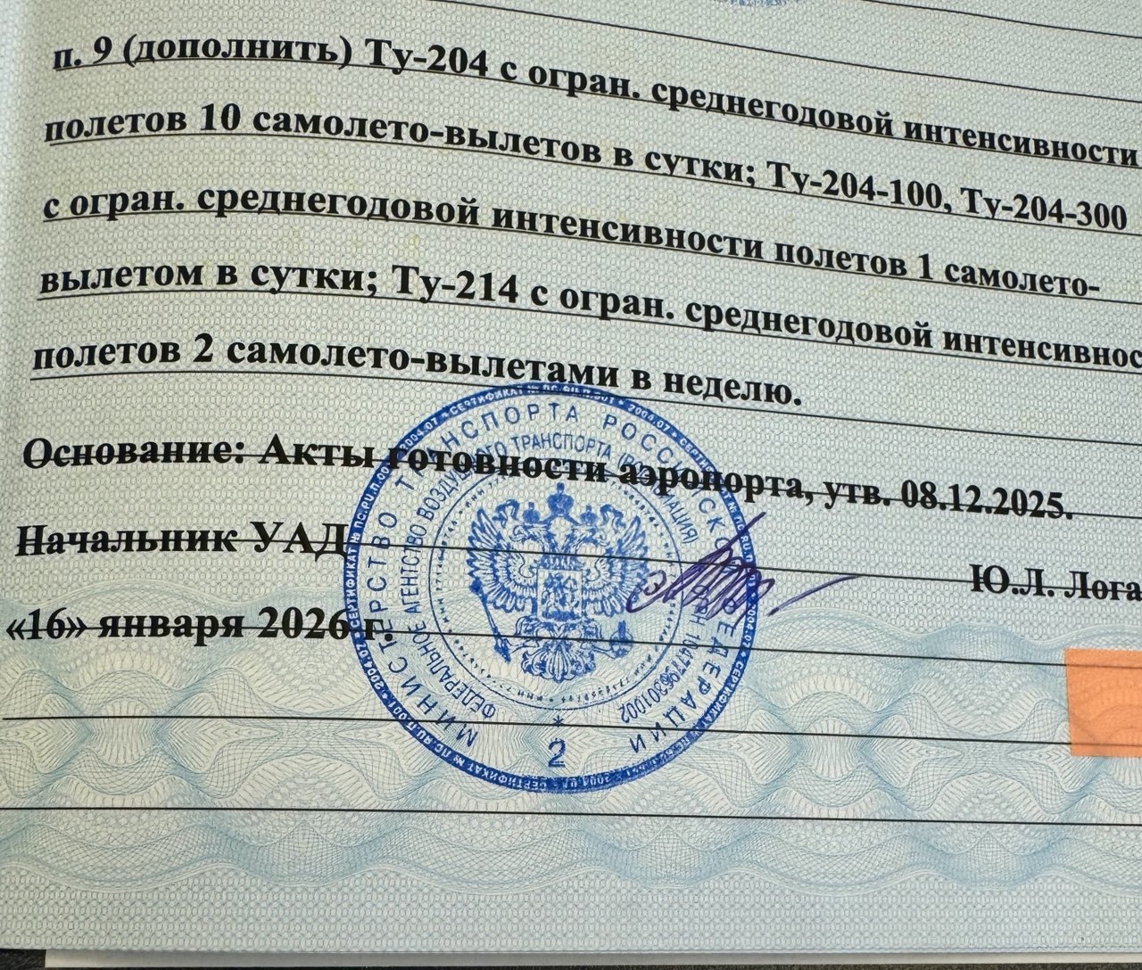 Как следует из приложенного документа, допуск устанавливает ограничения по интенсивности полетов: для Ту204 — до 10 самолето-вылетов в сутки, для Ту204100 и Ту204300 — до 1 самолето-вылета в сутки, для Ту214 — до 2 самолето-вылетов в неделю.