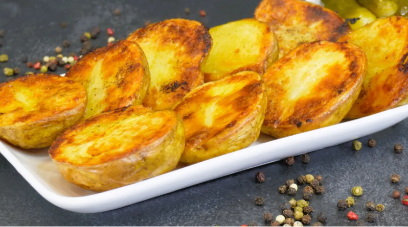 4. Готовый картофель должен стать румяным и хрустящим. Проверьте его готовность, проткнув ножом — он должен быть мягким внутри.
