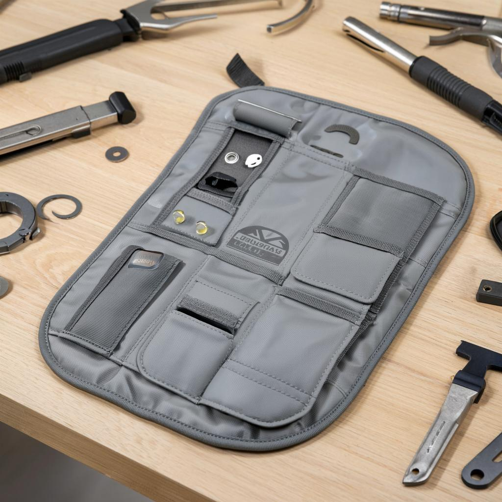Конструкция коврика проста, но требует тщательного подхода. Прямоугольник размером около 40 на 60 см будет достаточно удобным для коленей и легко помещаться в любом месте. Основу следует составить из двух или трех сегментов, соединенных прочной тканью. Также важно учесть карманы, которые можно разместить по своему усмотрению: большой карман для объемных предметов с одной стороны и система маленьких карманчиков с другой. Откидные клапаны помогут сохранить содержимое карманов при переноске.