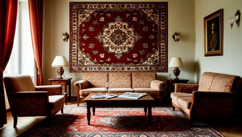 Ковер, вывешенный на стене, не был модной приметой, а действительно выполнял роль тепло- и звукоизолирующего слоя. В домах с холодными стенами он добавлял дополнительный барьер, помогал поддерживать более комфортный микроклимат и снижал расход энергии в суровые времена года.