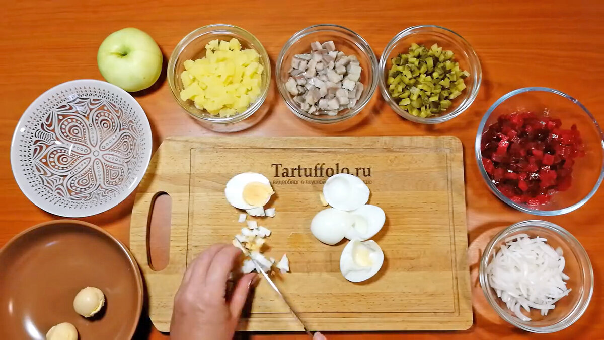 В миску отправляются все ингредиенты: картофель, сельдь, маринованные огурчики и свекла, которая заранее настоялась в масле, чтобы не окрашивала остальные продукты. Добавляется лук и яблоко, порезанные так, чтобы сохранить свежесть вкуса и цвет.