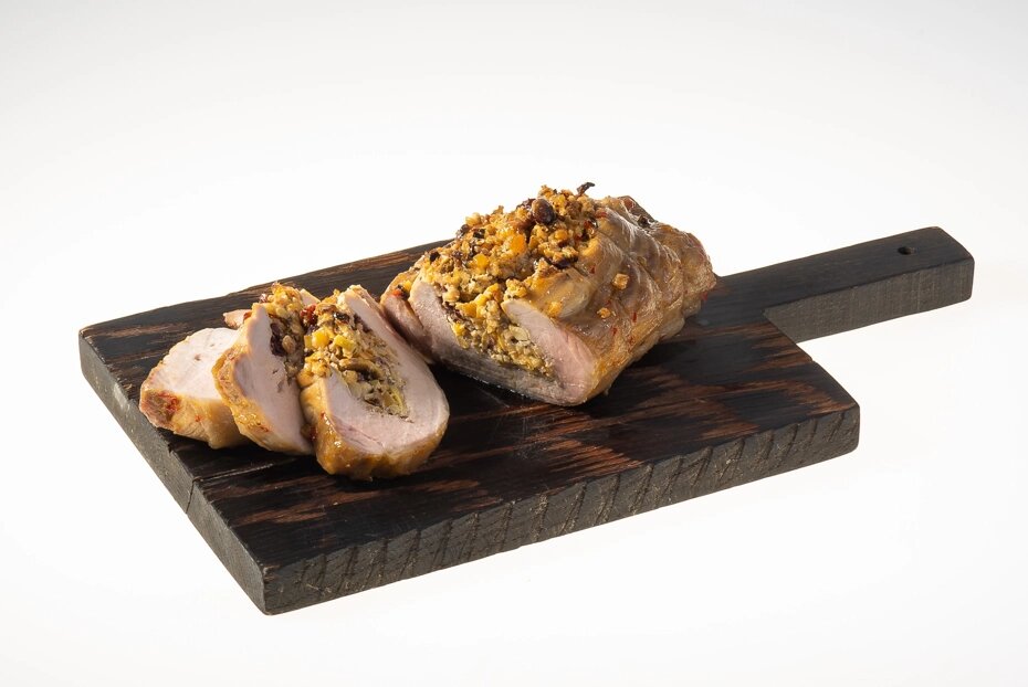 После чего мясо достать из соленад и сделать вдоль надрез, заполнить его начинкой и обвязать шпагатом. Поместить в разогретую до 250 градусов духовку, а спустя 10 минут понизить температуру до 120 градусов и смазать мясо глазурью. Готовить в течение 1,5 часов, периодически добавляя глазурь.