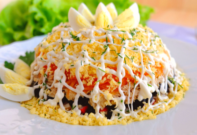 Кроме эстетической привлекательности, такой салат является сытным и полезным. Его цветная слоеная структура прекрасно украсит ваш стол, а непривычный вкус порадует даже тех, кто обычно не увлекается рыбными закусками.